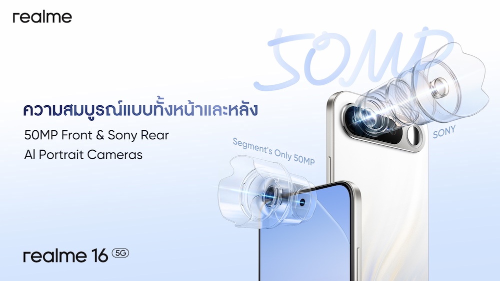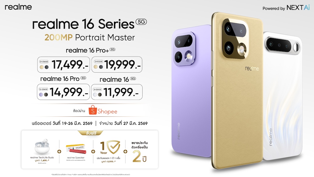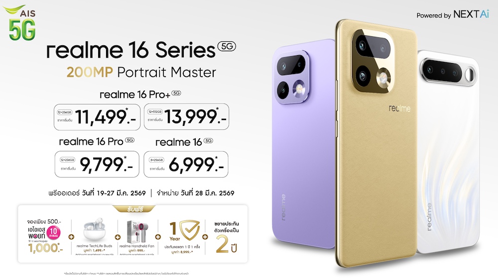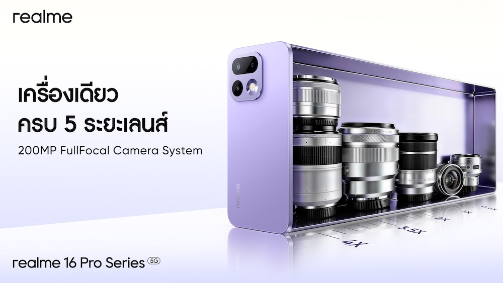 กรุงเทพฯ 19 มีนาคม 2569 – realme (เรียลมี) แบรนด์สมาร์ตโฟนเพื่อคนรุ่นใหม่ที่เติบโตเร็วที่สุดในโลก รุกตลาดมือถือระดับพรีเมียมไตรมาสแรกของปีด้วย “realme 16 Series 5G” ส่งสมาร์ตโฟนตัวท็อปลุยตลาดพร้อมกันถึง 3 รุ่น ทั้ง realme 16 Pro+ 5G, realme 16 Pro 5G และ realme 16 5G โดยชูจุดเด่นที่ไม่เหมือนใครด้วยระบบกล้อง 200MP LumaColor Portrait Master หนึ่งเดียวในเซกเมนต์ ที่จะพลิกโฉมวงการถ่ายภาพพอร์ตเทรตให้ก้าวล้ำยิ่งกว่าเดิม มอบภาพถ่ายที่สวยราวกับสตูดิโอมืออาชีพ พร้อมตัวเครื่องที่สวยล้ำแบบ Urban Wild Design ที่สร้างสรรค์ร่วมกับปรมาจารย์ด้านการออกแบบสไตล์มินิมัลระดับโลก “นาโอโตะ ฟุคาซาวะ” (Naoto Fukasawa) นำความพลิ้วไหวในธรรมชาติมาผสานเข้ากับความหรูหราของชีวิตชาวเมือง ถ่ายทอดลงบนสมาร์ตโฟนได้อย่างสวยงามลงตัว พร้อมประสิทธิภาพการทำงานรอบด้าน ตอบโจทย์ทั้งการทำงาน การพักผ่อน และกิจกรรมไลฟ์สไตล์ในหนึ่งเดียว