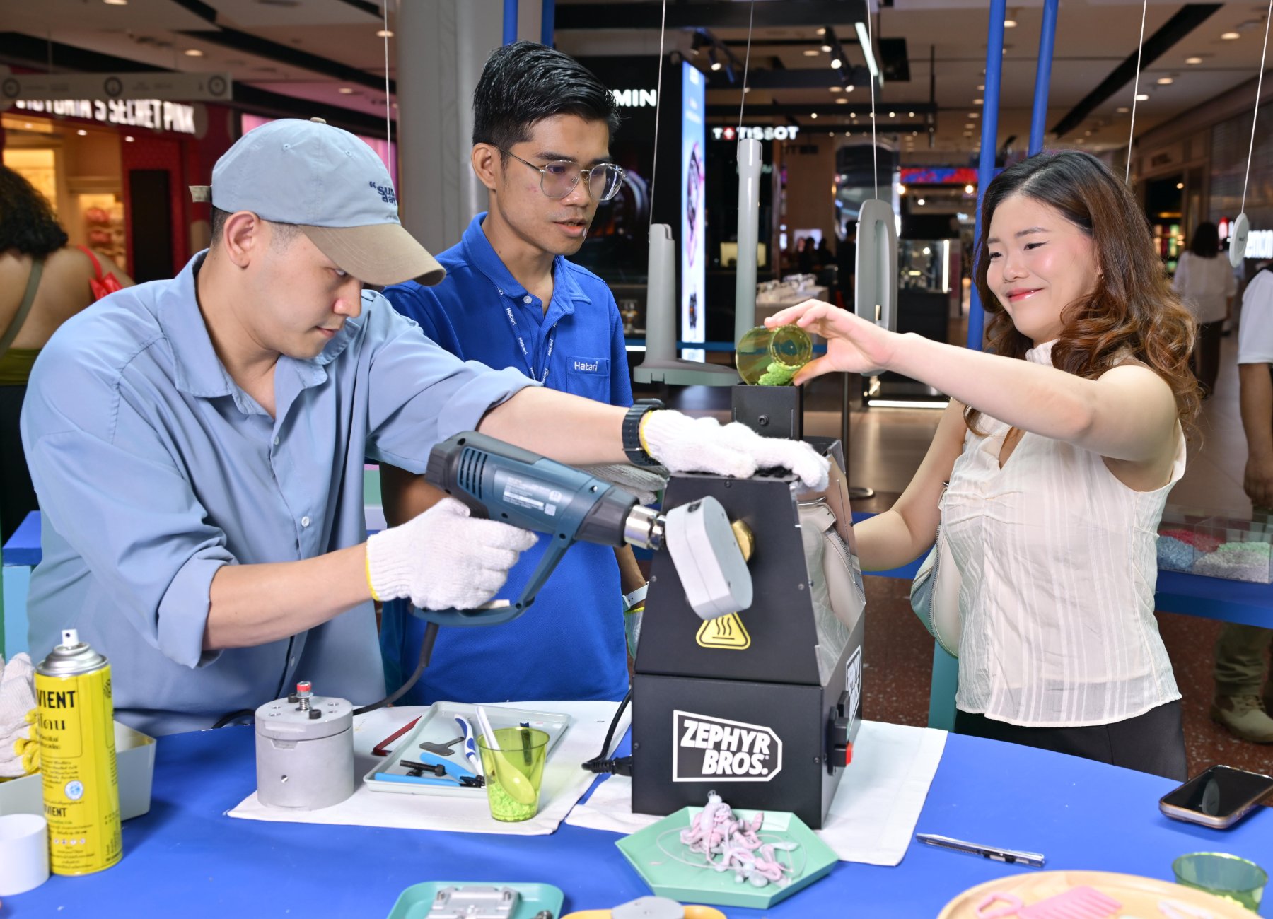 4. DIY พวงกุญแจพลาสติกรีไซเคิล Old Fan to New Charms: กิจกรรม DIY ปิดท้ายงานที่เปิดโอกาสให้ผู้ร่วมงานได้ทำพวงกุญแจที่ระลึกจากวัสดุรีไซเคิล โดยนำชิ้นส่วนพลาสติกจากพัดลมเก่าที่ผ่านการแปรรูปมาทำเป็นชาร์มหลากหลายสีและรูปทรง สำหรับตกแต่งพวงกุญแจในสไตล์ของตนเอง